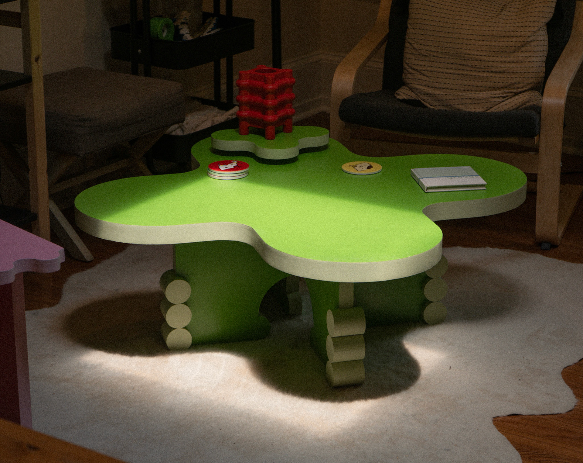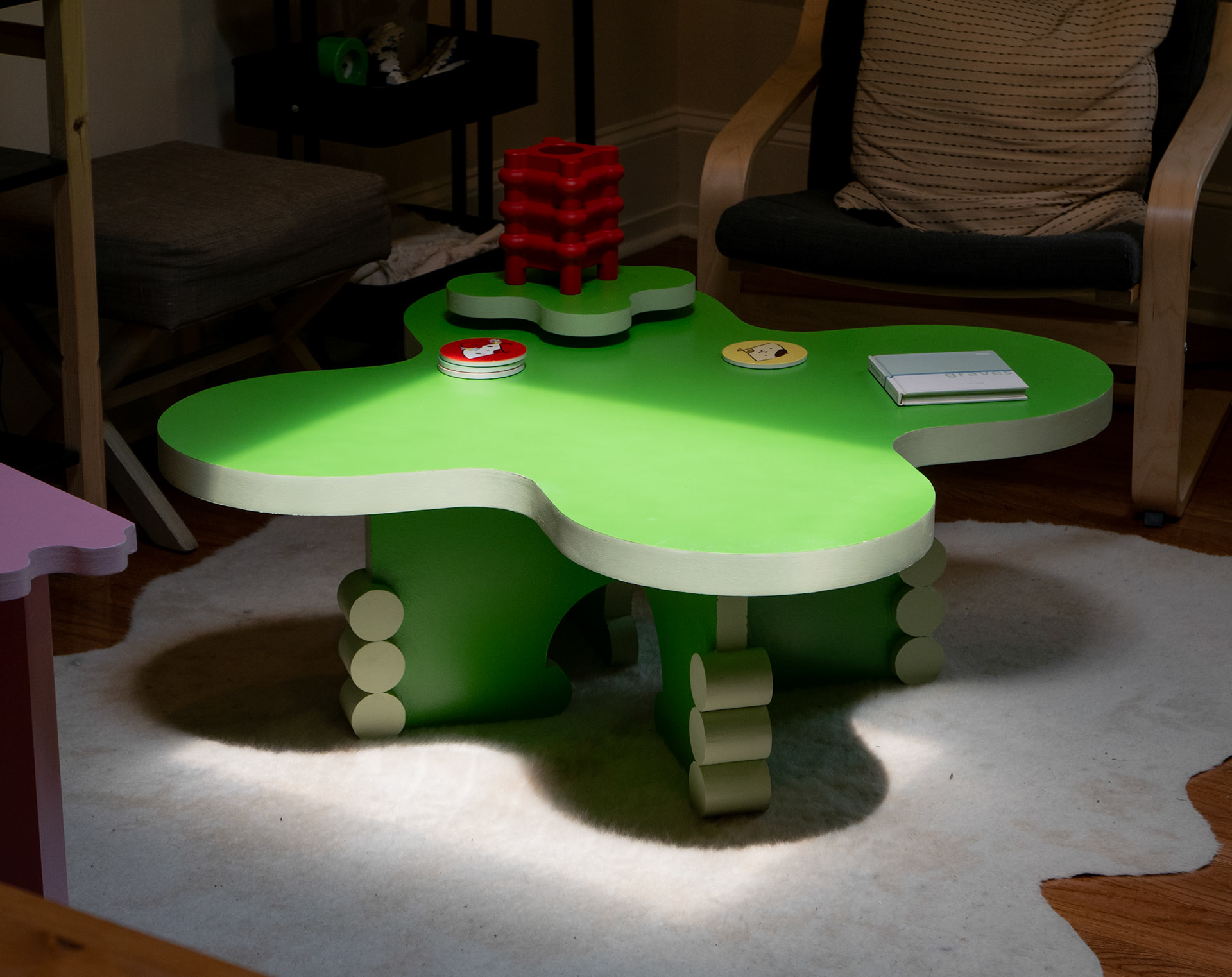is a coffee table meant to be the central pivot of the room. It has a movable mini lazy suzan piece on top which mirrors those revolving around it