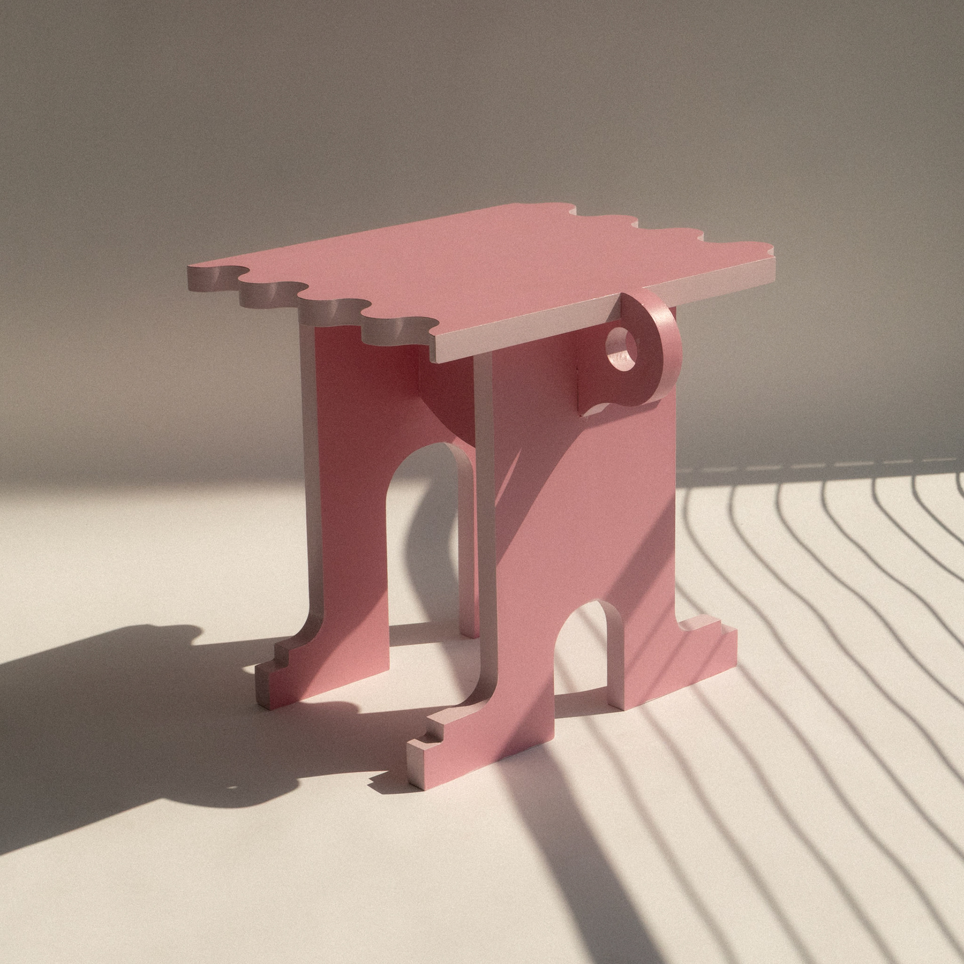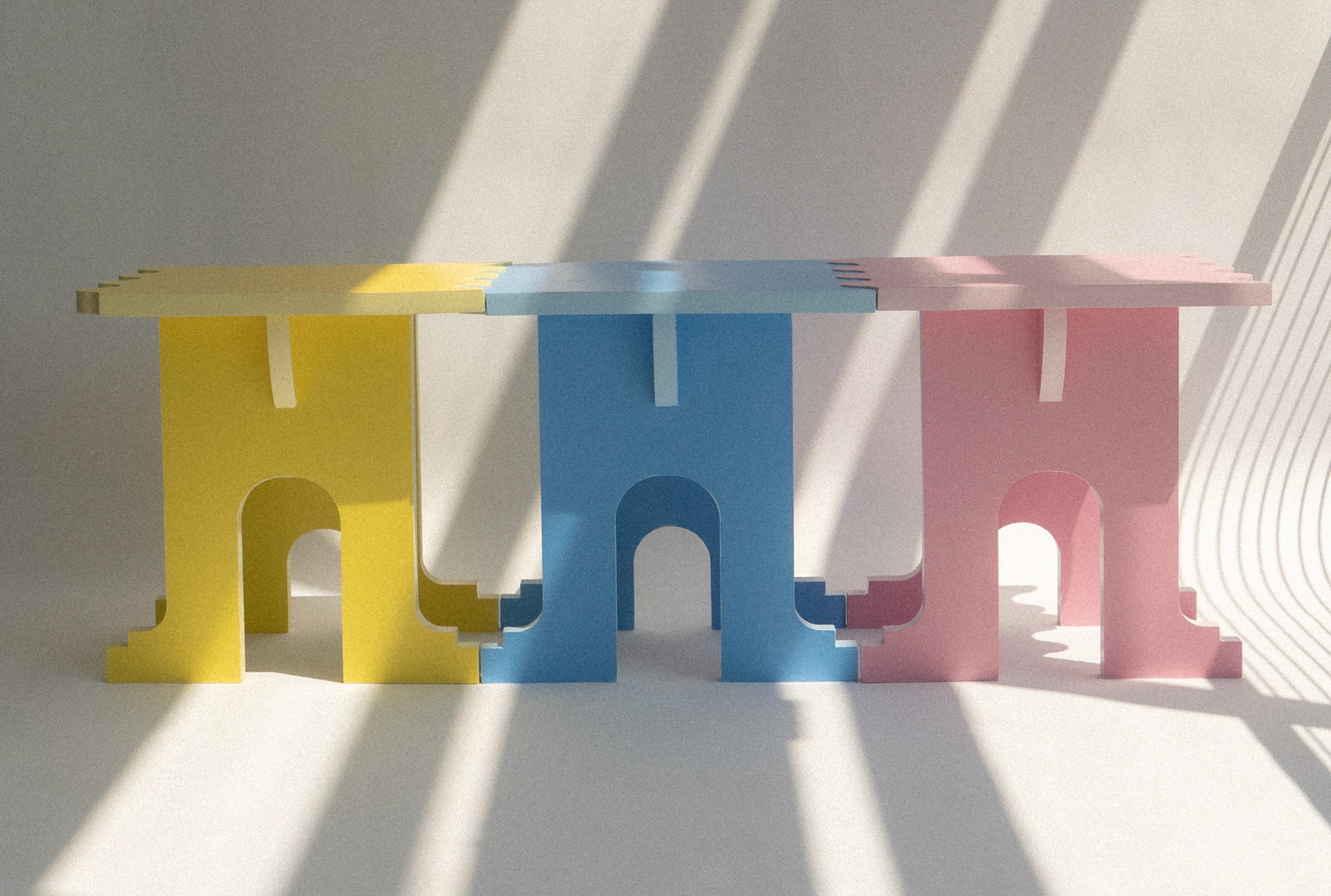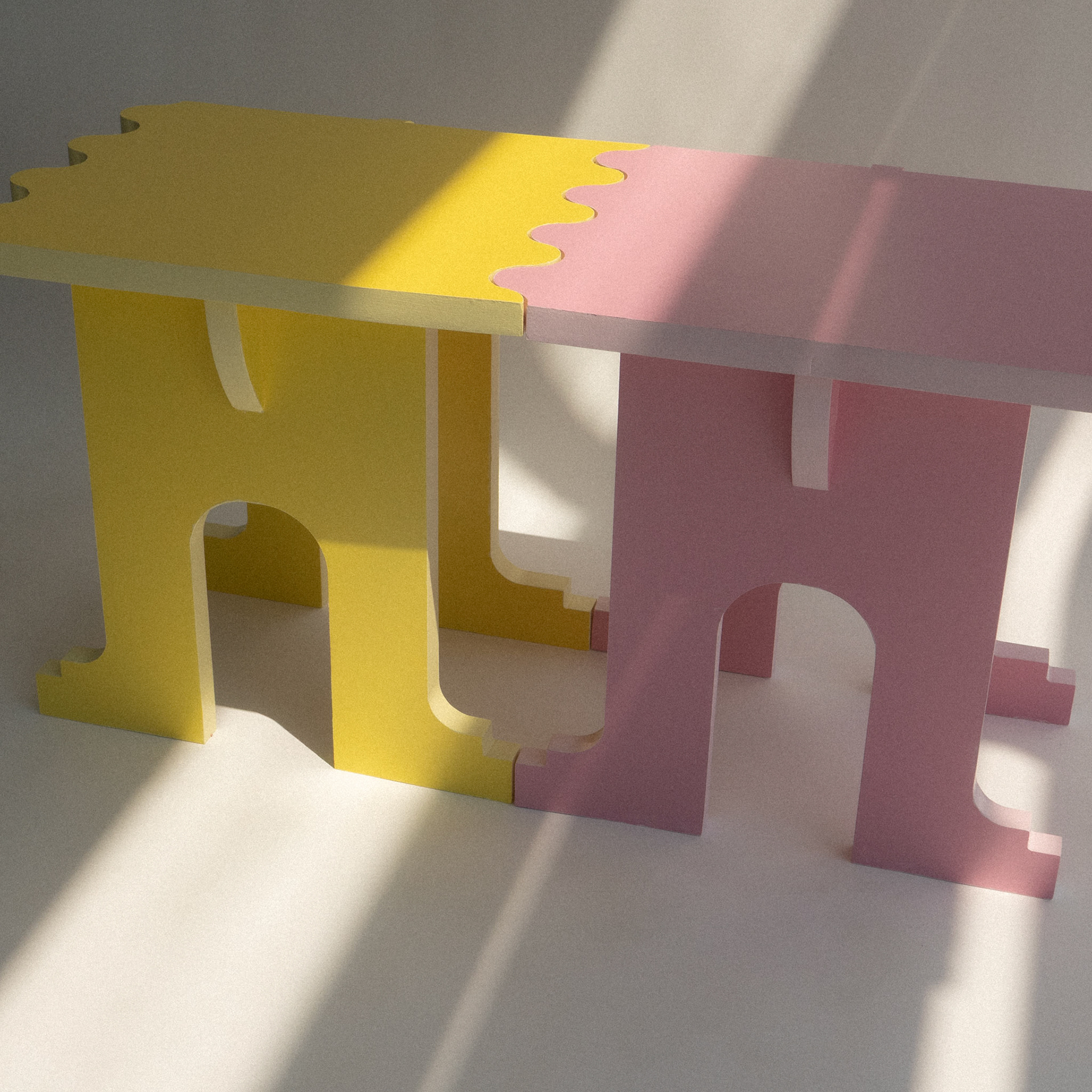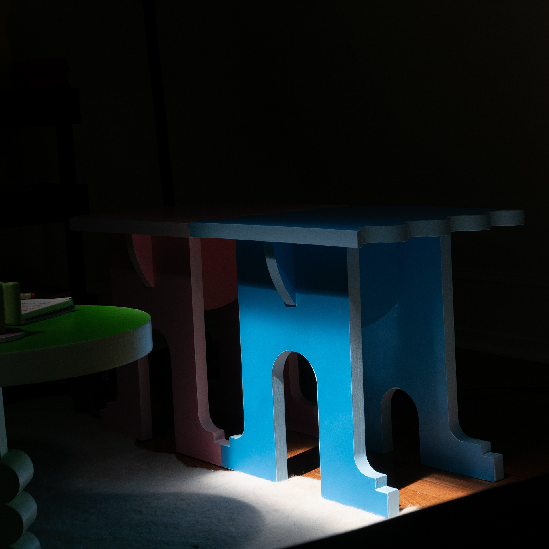 is a stool that transforms into a bench when another stool is introduced through their swiggle edges. Call me crazy but I think its their way of holding hands.